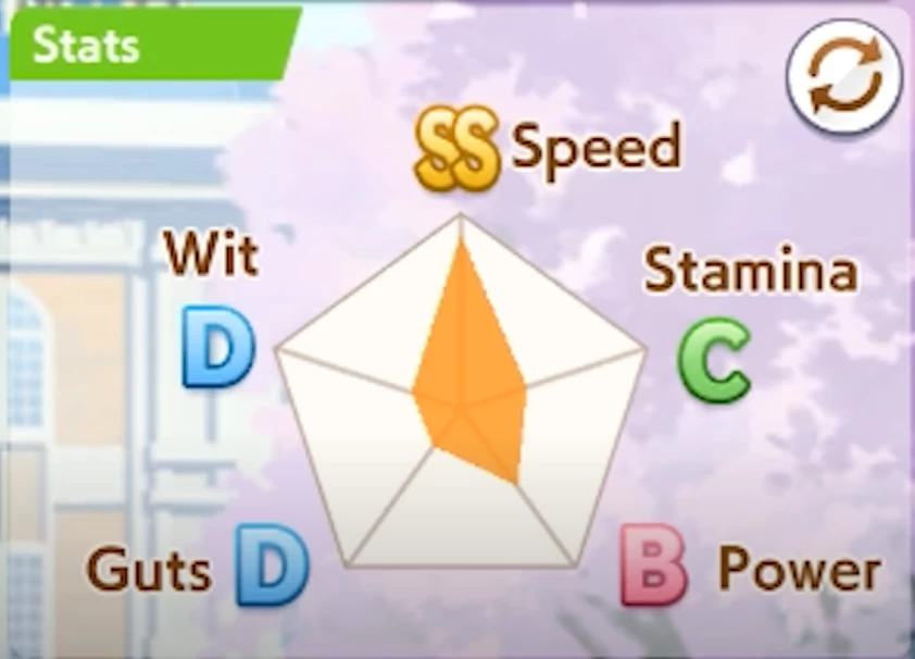 В Umamusume: Pretty Derby есть 5 основных статов: скорость (Speed), выносливость (Stamina), сила (Power), упорство (Guts) и ум (Wit). В глобальной версии каждую характеристику можно прокачать до 1200 очков. По мере выхода новых обновлений этот кап будут повышать.