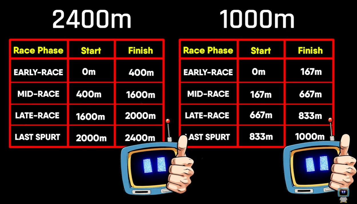 Каждая гонка в Umamusume: Pretty Derby разбита на 4 фазы независимо от того, насколько она долгая или короткая. Разберём эти фазы на примере гонки на 2400 метров: