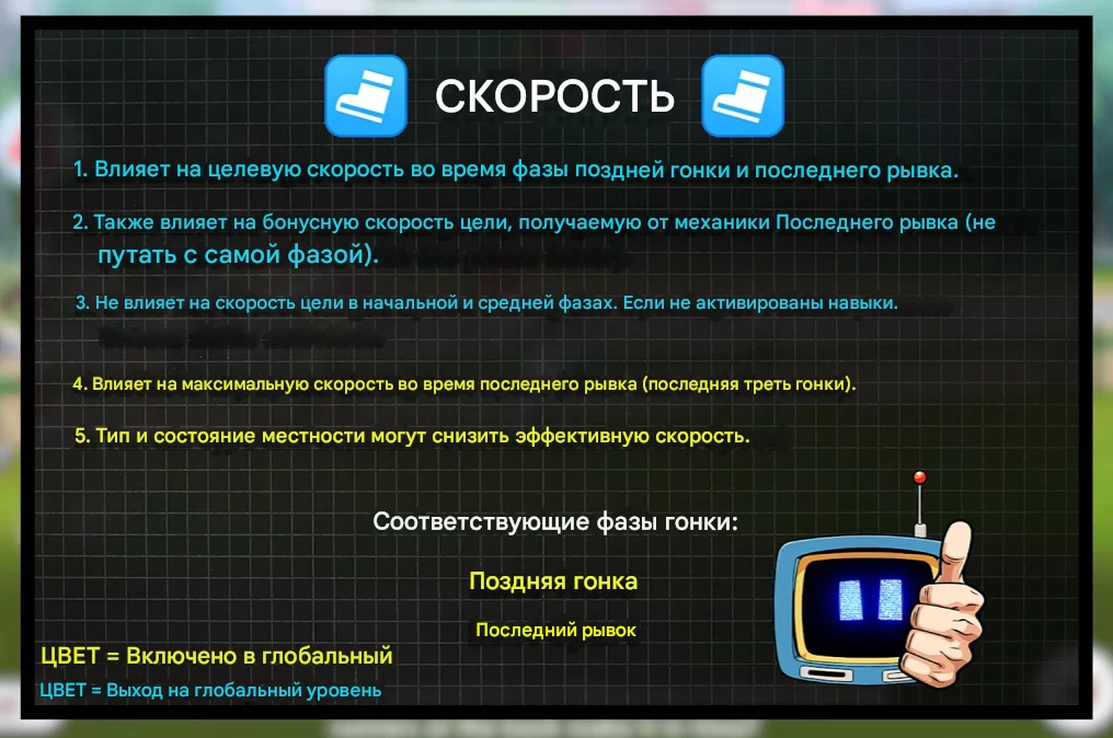 Параметр Speed влияет на «целевую скорость» во время последних фаз гонки. Иными словами это максимальная скорость, которую ваша пони может развить при благоприятных условиях. Если не активированы навыки, то этот стат не повлияет на скорость пони на начальной и средней фазе гонки. Посмотрим, что ещё влияет на скорость: