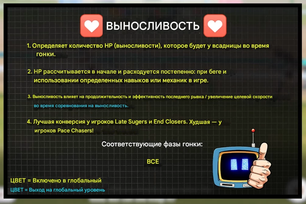 Чем больше стамины у пони, тем дольше она может бежать, не снижая скорость. Этот стат особенно важен на средних и длинных дистанциях, так как под конец ваша пони может выдохнуться, замедлиться и её обгонят. Выносливость тратится постепенно на бег, использование скиллов и некоторые игровые механики. Также она влияет на длительность и эффективность «последнего рывка», но стоит учитывать, что стамина работает во всех фазах.