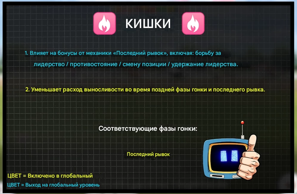 В глобальной версии упорство уменьшает расход выносливости в последних фазах. Но это не главное преимущество данного стата — если две пони одновременно финишировали (ничья), то выигрывает та, у которой больше Guts.