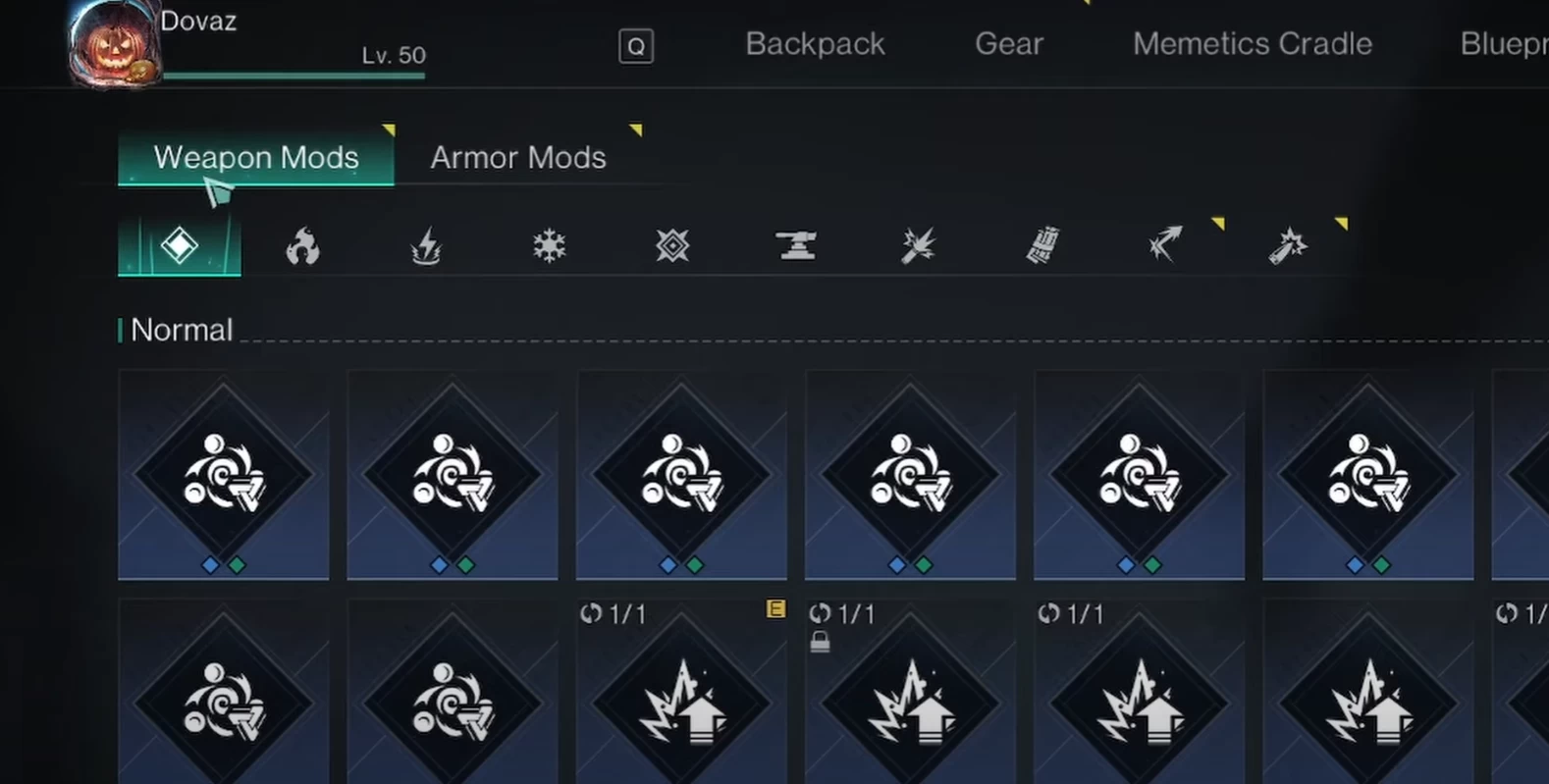 Моды разделяются на 2 основные группы — для оружия и для одежды. Помимо этого они разделены на стихии и другие «ключевые слова», которые привязаны к вашей пушке: например, если ваше оружие дополнительно наносит огненный урон, будет логично вставить в него соответствующий мод.