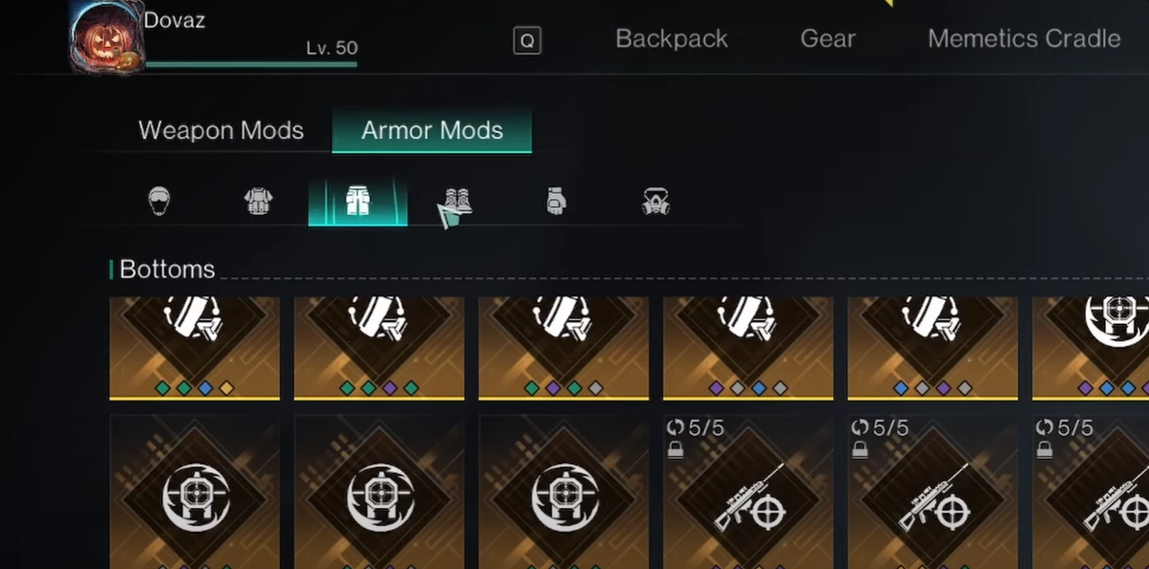 - Оружие и маска — в эти слоты устанавливаются моды, усиливающие свойства вашего оружия: шрапнель, взрыв и другие эффекты. При выборе следует ориентироваться на специализацию (PvP или PvE).