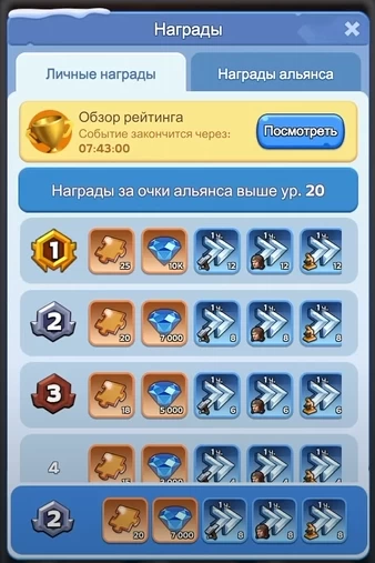 - Альянс — при покупках участниками альянса все получают дополнительные награды. Также ежедневные и еженедельные взносы приносят алмазы. Помимо этого стоит захватывать форты и крепости по пятницам.