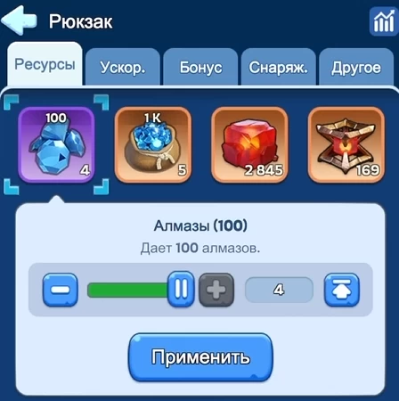 - Банк — вклады алмазов под проценту (доступно при условии первой покупки в игре). Пример: вложение 6500 алмазов под 5% даёт доход 6825 алмазов.