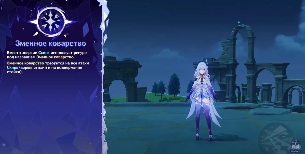 Скирк — новый 5-звёздочный персонаж в Genshin Impact с одноручным оружием и Крио-уроном, которого добавят в игру 18 июня 2025 года. Первое, что важно знать — Скирк не имеет Глаз бога и не пользуется элементальной энергией. Вместо этого у неё есть специальный ресурс, который называется «Змеиное коварство». Этот ресурс требуется на все атаки Скирк (взрыв стихии и на поддержание стойки).