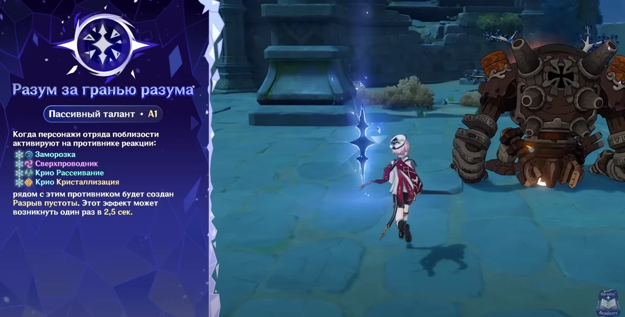 «Взаимное наставничество по оружию» — если отряд полностью состоит из Гидро или Крио-персонажей, и есть хотя бы по одному персонажу Гидро и Крио, уровень элементального навыка вашего отряда увеличивается на 1.