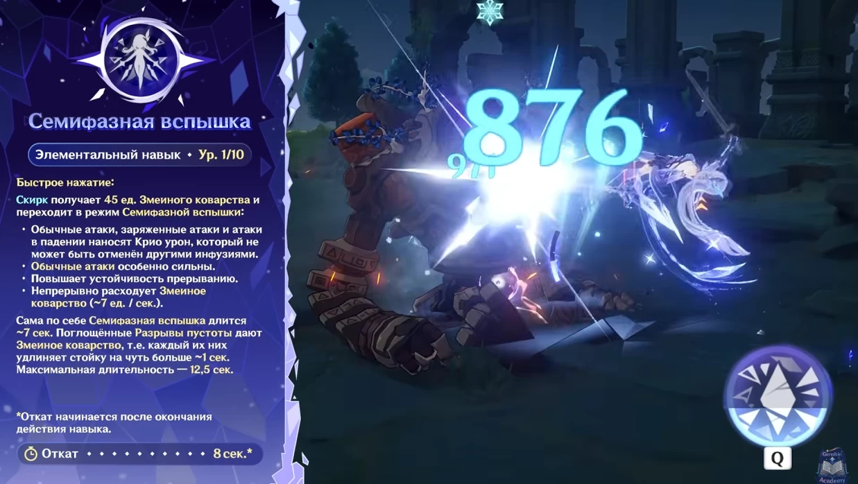 У Скирк может быть максимум 100 единиц змеиного коварства. Источники его получения: элементальный навык (быстрое и долгое нажатие дают 45 единиц) и разрыв пустоты (8 единиц за штуку). О последнем способе поговорим подробнее.