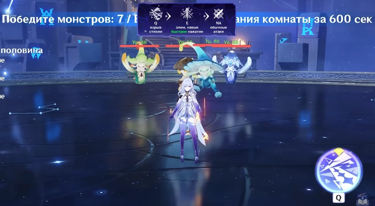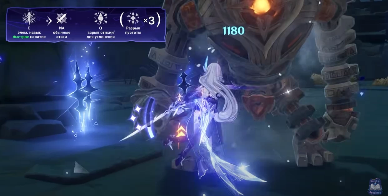 В роли главного ДД у Скирк нет особых комбо — вы используете элементальный навык и спамите базовую атаку по врагу. Когда змеиного коварства остаётся мало, используйте взрыв стихий или заряженную атаку, чтобы поглотить Разрывы.