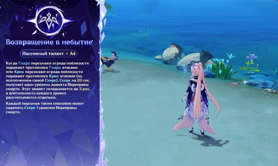 «Возвращение в небытие» — когда Крио или Гидро-союзник наносит урон врагу, Скирк получает усиление на 20 секунд. Эффект складывается до трёх раз. Причём иммунитет врага к этим стихиям не помешает накапливать бафф.