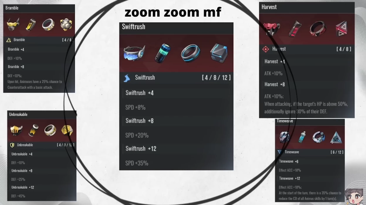 Важность сета Swiftrush заключается в том, что в игре есть как минимум 6 персонажей, которые наносят неприятный AoE с дебаффами по типу замедления на два хода. Если они ходят первыми, то ваша группа будет в невыгодном положении.