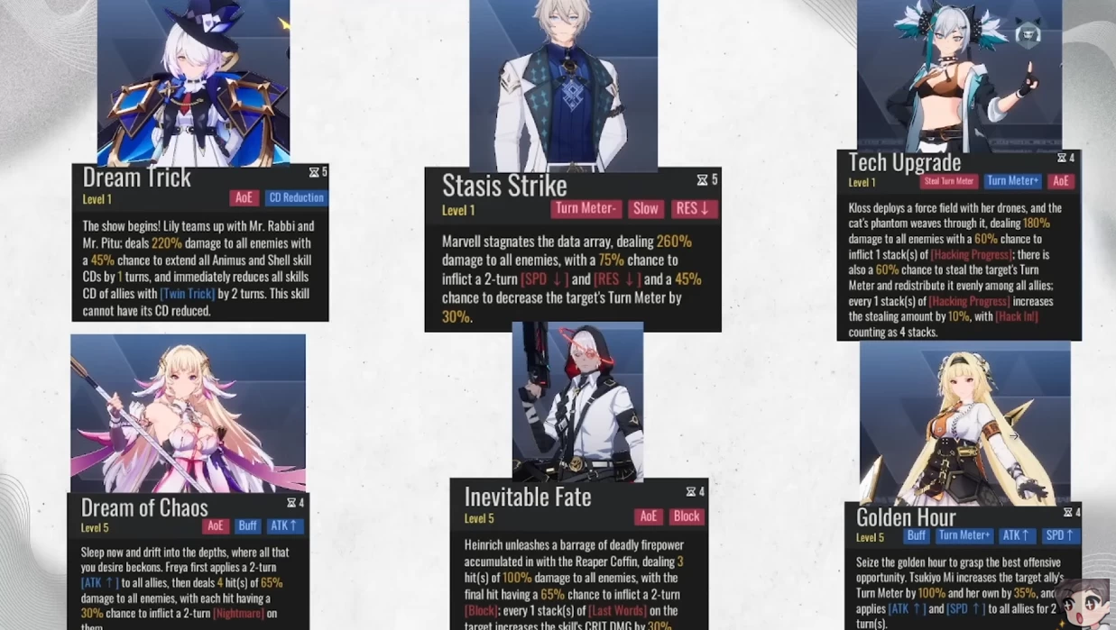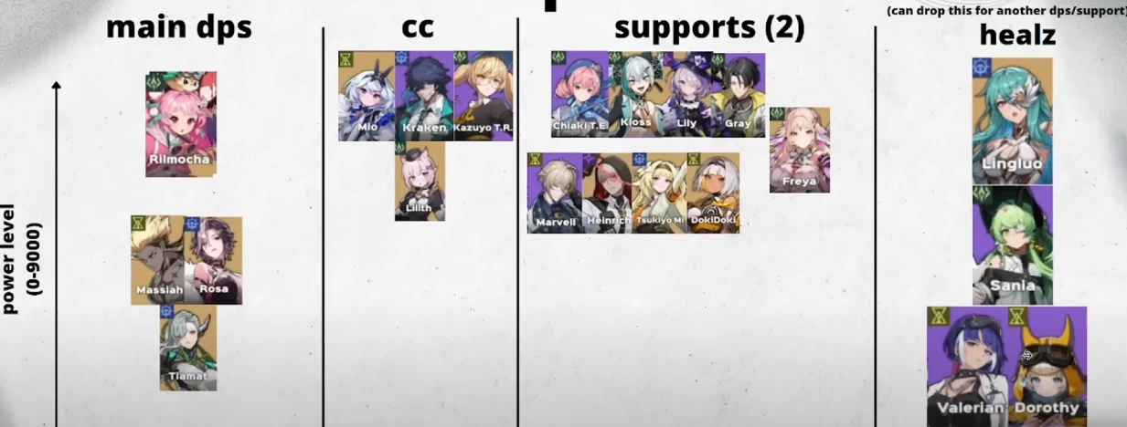 Персонажей можно условно разделить на 4 роли: основной DPS, контроль толпы, саппорты и лекари. Стоит отметить, что в команду необязательно брать лекаря, но для подстраховки его можно взять — без него вы по сути не пытаетесь продержаться как можно дольше, а пытаетесь нанести максимум урона за то время, что у вас есть.