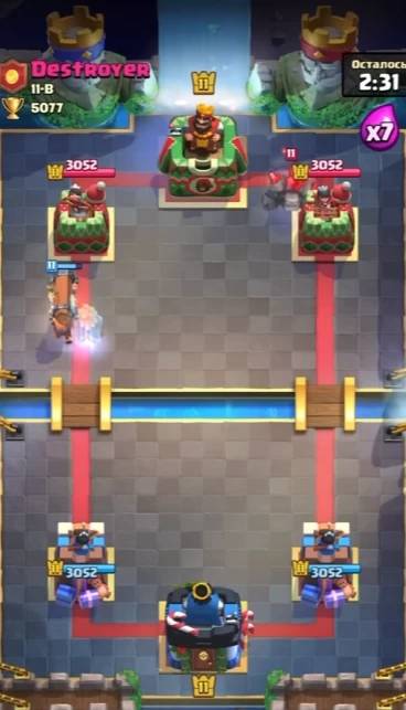 Наказание за ошибки — когда противник тратит много эликсира (например, ставит Голема с глубины), немедленно начинайте агрессию спамом карт с моста.