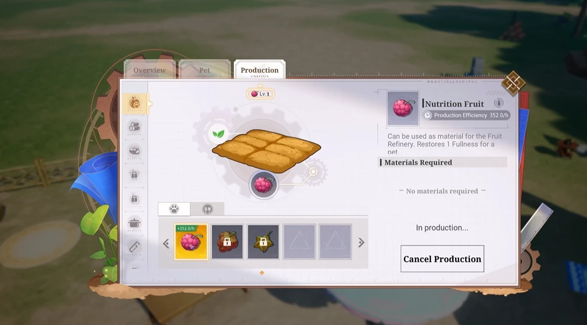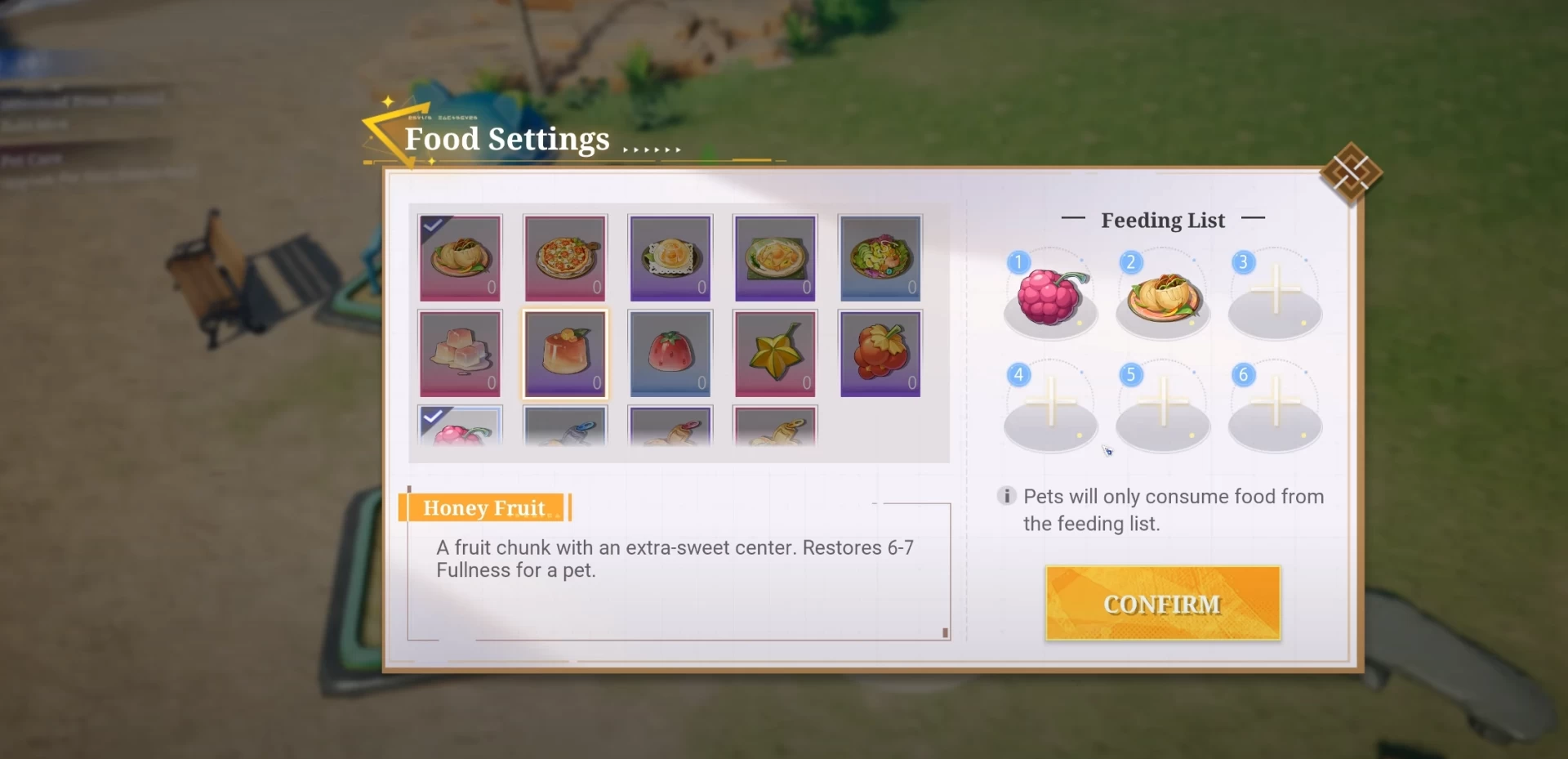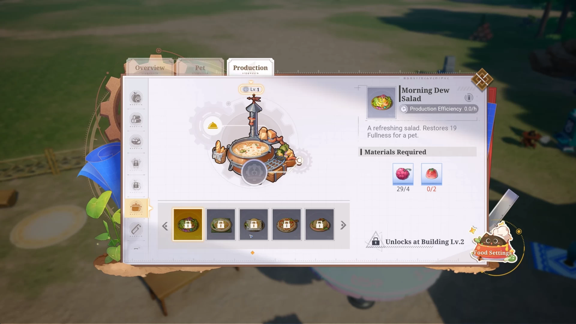 Питомцы получают еду из фермерских грядок. Чем больше у вас занятых петов, тем больше таких ферм нужно построить. Кроме того, на грядках можно выращивать особые ингредиенты, которые понадобятся вам в будущем для приготовления еды. Таким образом ваши петы будут быстрее насыщаться. Выставлять еду для питомцев нужно на специальном столе. Вы выбираете слоты, а после ваши подопечные будут сами подходить и выбирать, что им нравится. Кстати, еда имеет разные уровни редкости, где самая редкая пища моментально восстанавливает голод.