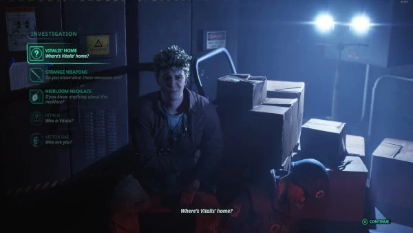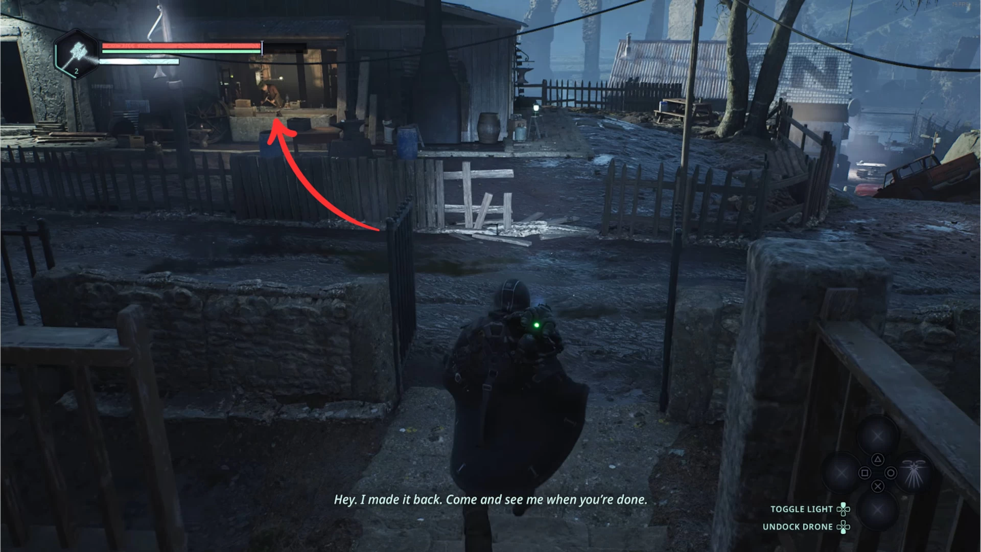 Выйдя из дома, вы увидите Виктора, который зовёт вас из кузницы. Взаимодействуйте с Виктором и снова поговорите с ним на все предложенные темы. Теперь вы можете прокачивать своё оружие и экипировку, а также создавать расходные материалы и осколки.