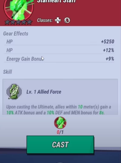 Второй вариант — Starheart Staff. Этот посох имеет такие же статы, как и Purple Ray Radiation, но иной скилл. С ним, когда Рэйвен кастует ультимейт, союзники в пределах 10 метров получают +10% к атаке и +10% к защите на 8 секунд.