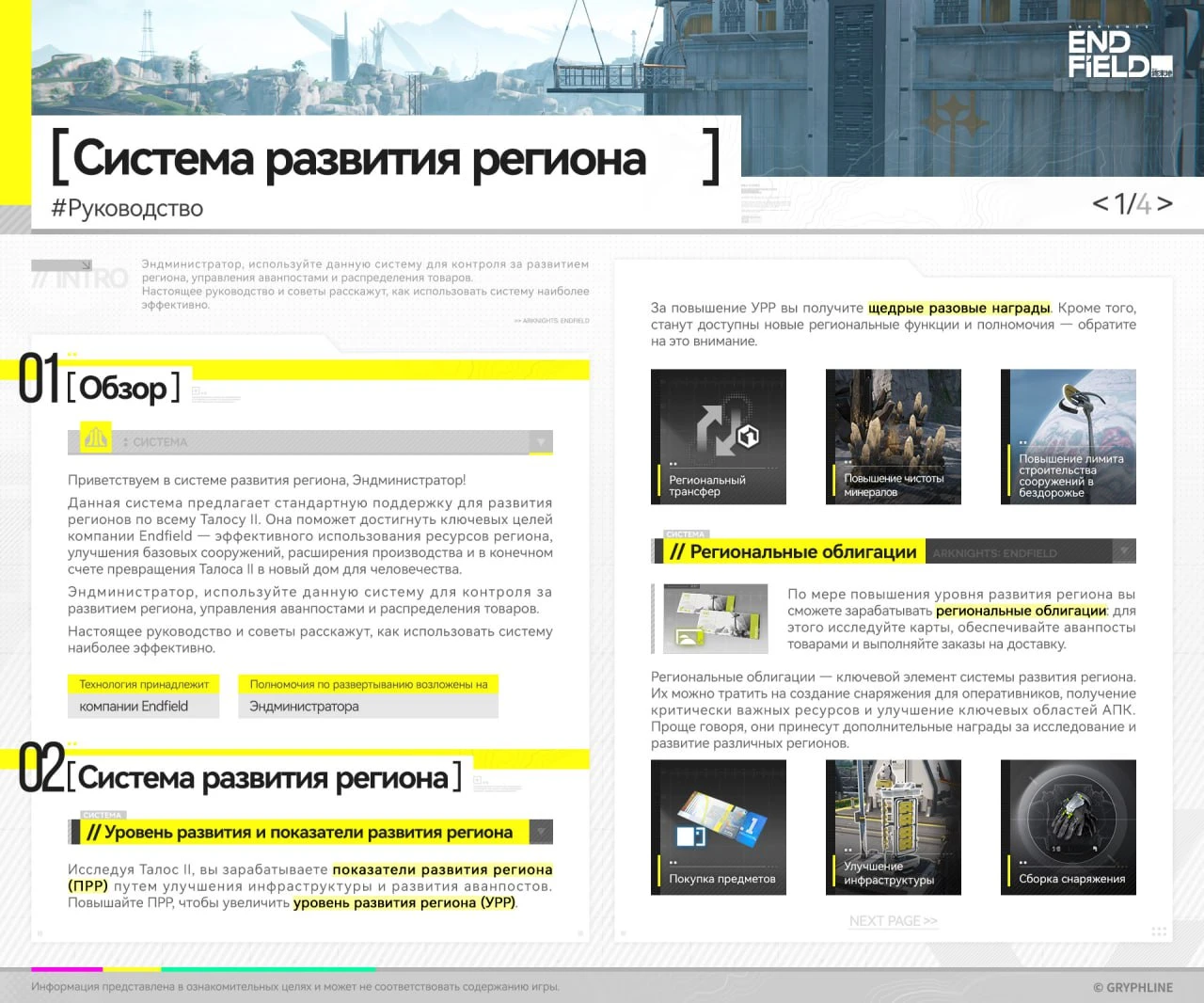 Исследуя Талос II, игроки Arknights Endfield улучшают инфраструктуру и развивают аванпосты. За это они зарабатывают очки развития региона и увеличивают уровень развития региона, плюс получают щедрые разовые награды. Кроме того, им становятся доступны новые функции и полномочия. Например, повышается чистота минералов и повышается лимит строительства сооружений в дикой местности.