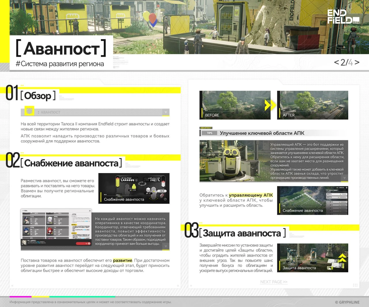 На всей территории Талоса II компания Endfield строит аванпосты и создаёт новые связи между жителями регионов. Разместив аванпост, вы сможете его развивать и поставлять в него товары. Взамен вы получаете региональные облигации.