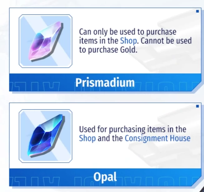Opal и Prismadium — два типа премиальной валюты в игре. Prismadium использовать для покупки предметов в магазине, тогда как Opal можно купить за реальные деньги и использовать для покупки/продажи золота. Также большинство премиальных предметов и наборов продаются за оба типа прем. валюты, поэтому вам необязательно донатить всю свою зарплату.