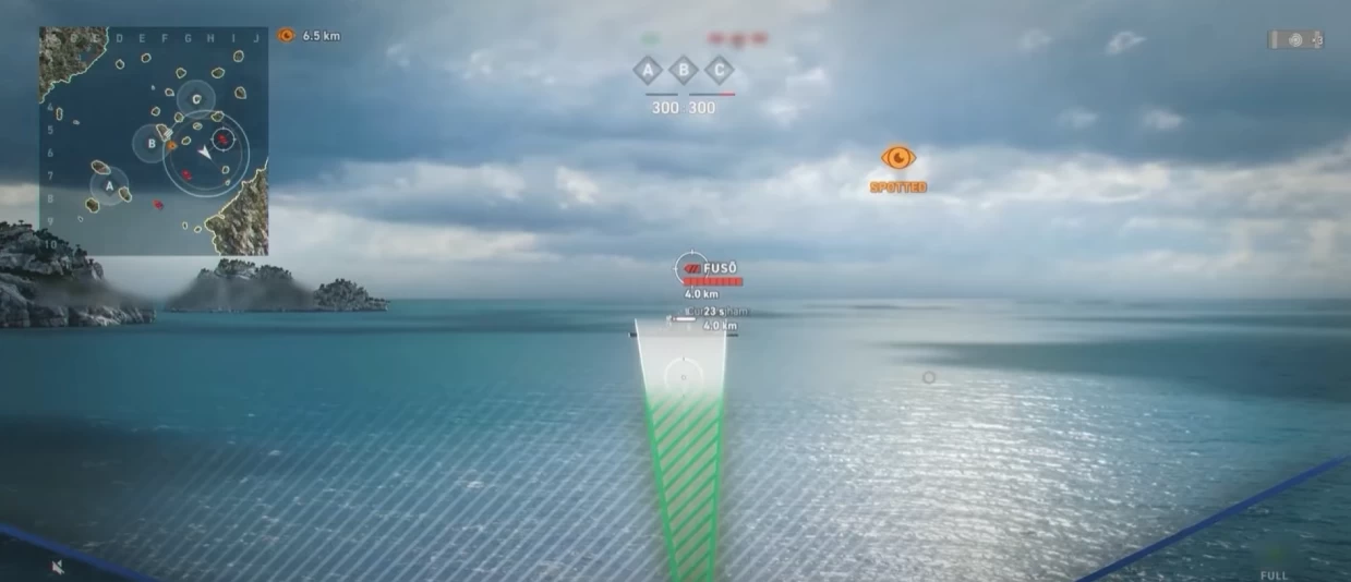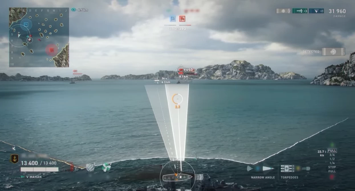После взведения торпеды можно отслеживать по треугольным значкам и характерному следу на воде: белым отмечены ваши торпеды, синим — союзные, а красным вражеские. Вам важно просчитывать траекторию движения вражеского корабля наперёд. Чтобы облегчить себе задачу, выберите корабль в качестве цели и переключитесь на торпеды. Вы увидите полупрозрачный конус. Он указывает идеальную точку наводки с учётом скорости, направления и дальности цели. Здесь даже приводится время до встречи с целью.