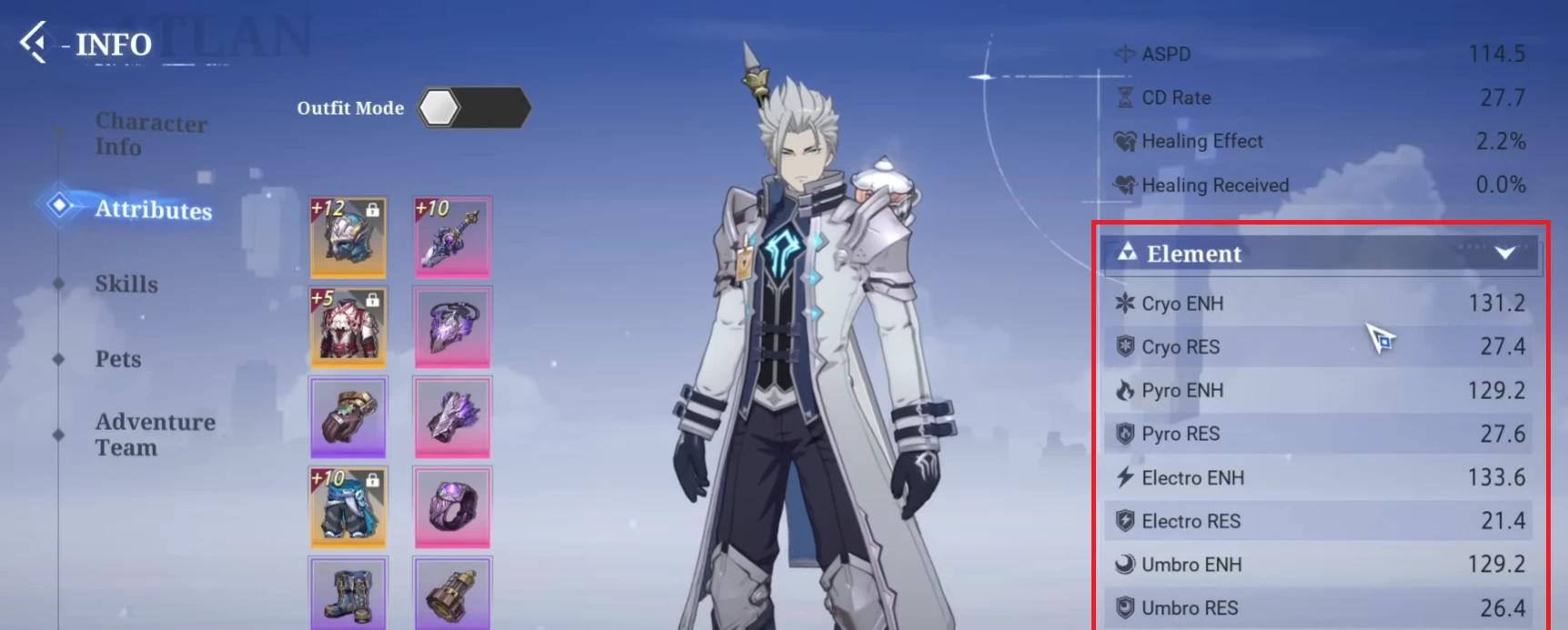 В Crystal of Atlan есть 4 стихии: крио, пиро, электро и тёмная. Сила вашей элементальной атаки зависит от того, насколько прокачан стат «название стихии + ENH». Увеличить такой урон можно с помощью экипировки, инсигнии, еды и зелий (временные баффы).