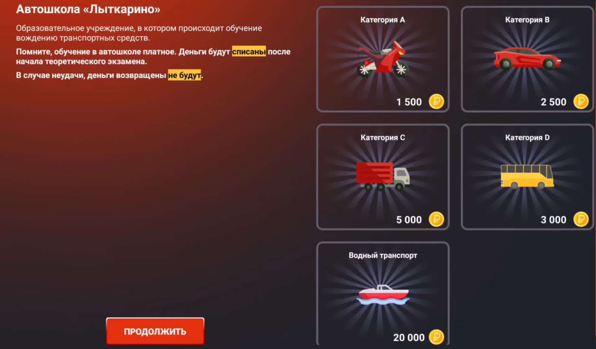 Если вы хотите кататься на крутых тачках и мотоциклах в Black Russia, а также работать водителем автобуса или фуры, нужно получить права. На старте вы можете кататься только на мопеде, чего достаточно, чтобы доехать до ближайшей работы и заработать деньги — они понадобятся для прохождения тестов или покупку прав.