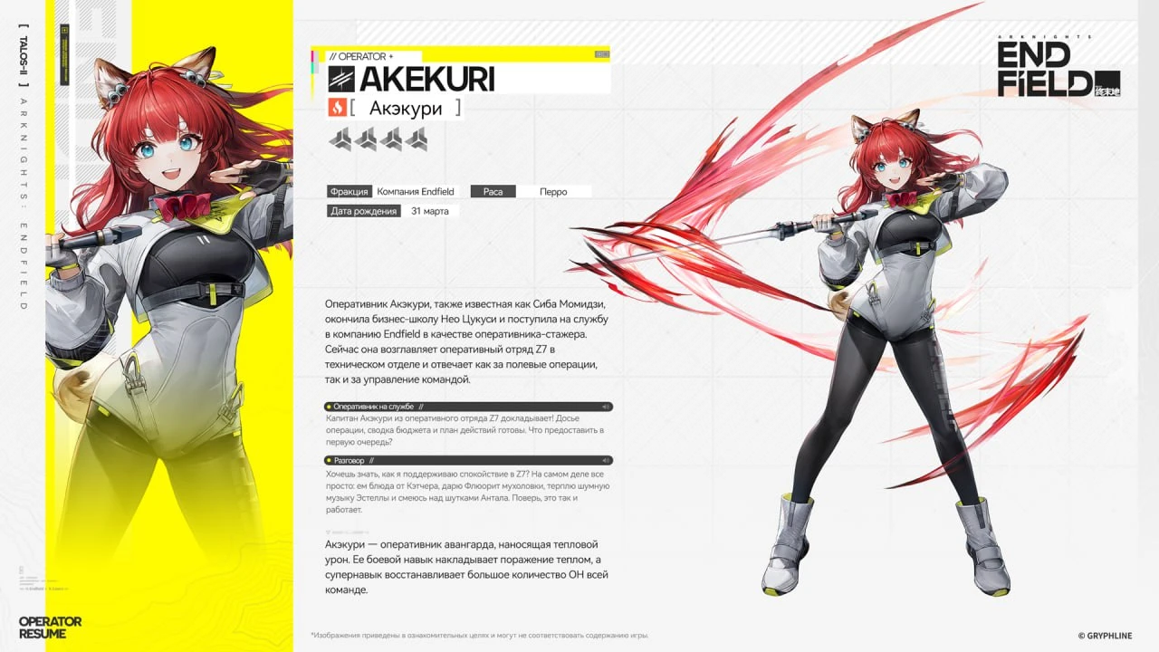 Возьмём для примера персонажа Акэкури — это 4-звёздочный оперативник, который относится к классу «Авангард» и стихии «Огонь». Её ультимейт восстанавливает большое количество ОН всей команде.