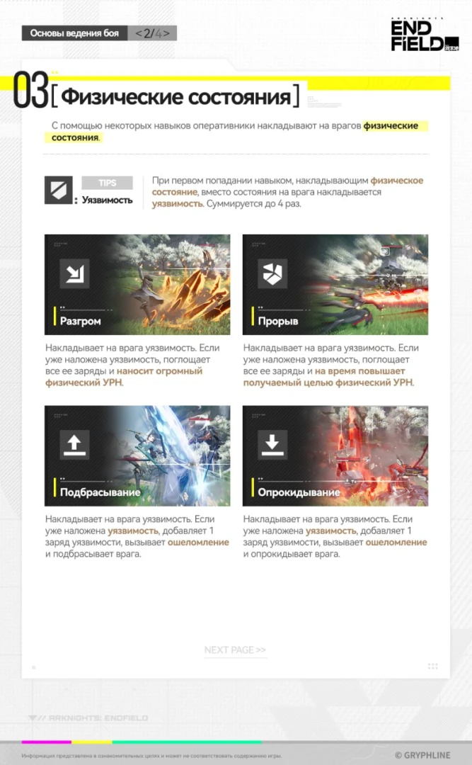 С помощью некоторых навыков оперативники накладывают на врагов физические состояния. При первом попадании навыком, накладывающим физическое состояние, вместо состояния на врага накладывается уязвимость. Суммируется до 4-х раз.