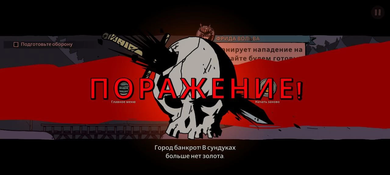 Чаще всего я умирал не от вражеского меча, а от действий в своём поселении. Например, у меня было много золота, поэтому я решил развить дома для увеличения численности населения, прокачать бизнесы, чтобы они приносили больше денег и укрепить стены, чтобы врагу было сложнее прорваться. Также я решил натренировать юнитов, ведь игра сама мне говорит: «Подготовьтесь к обороне, на вас скоро нападёт большое войско» (это вторая миссия). Но стоило мне увлечься процессом, как у меня становилось мало еды и золота или я тратил их куда быстрее, чем мог нафармить. И только отметка одного из этих ресурсов доходит до нуля вы автоматически проигрываете. Всё, нужно начинать заново или с контрольной точки. И, будто бы издеваясь над игроком, кнопки «Назад в главное меню» и «Начать заново» находятся позади слова «ПОРАЖЕНИЕ!».