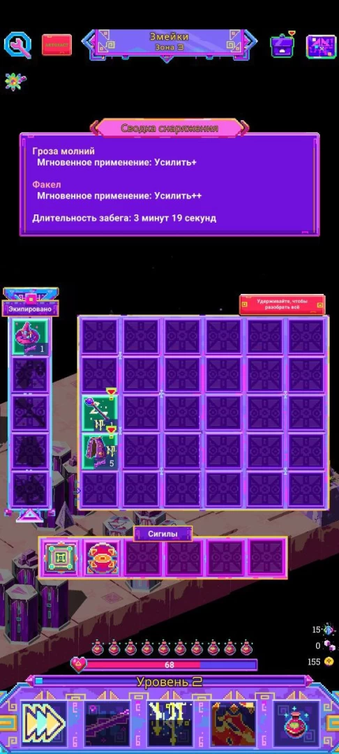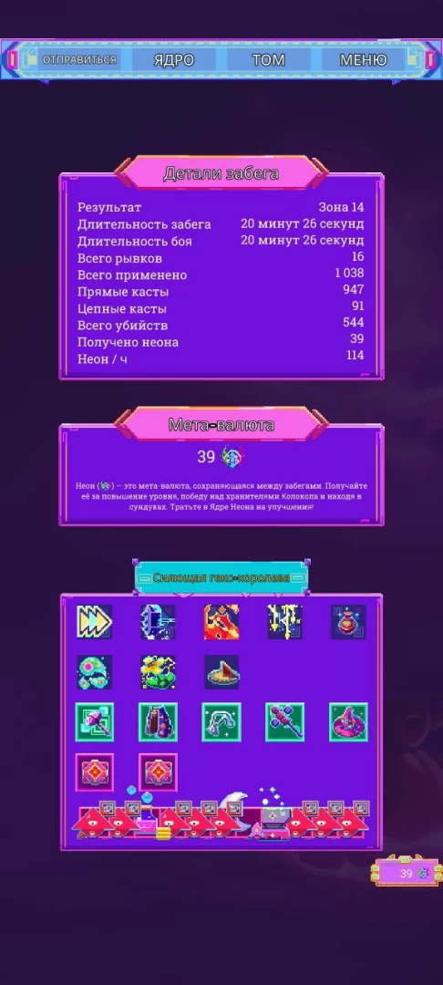 После забега вам показывают статистику — какая у вас была экипировка, сколько минут на него потратили, сколько рывков сделали, сколько монстров убили. По сути это способ потешить своё ЧСВ и посмотреть, как далеко вы продвинулись на этот раз. А перед началом следующего этапа вы можете выбрать нового персонажа, модификаторы, заклинания и снаряжение. Конечно, если всё это у вас открыто.