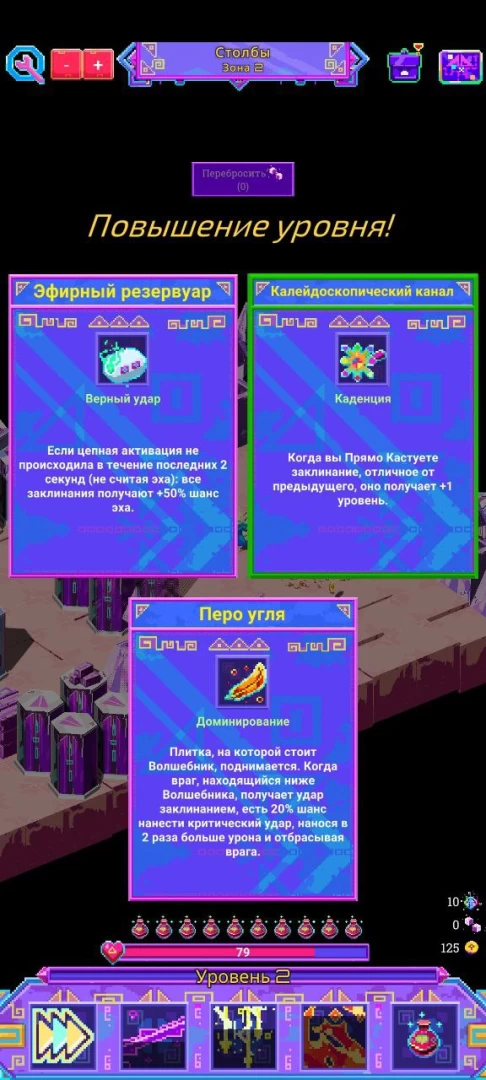 Если повысить свой уровень (сделать это сложно, так как нужно много опыта), игра предложит вам 1 из 3 случайных усилений на выбор. Визуально сложно понять, какие из них крутые, а какие так себе. Читая описание на русском языке и не понимая глубоких механик игры, больше путаешься и выбираешь наугад, чем создаёшь «свой уникальный билд под свой стиль игры».