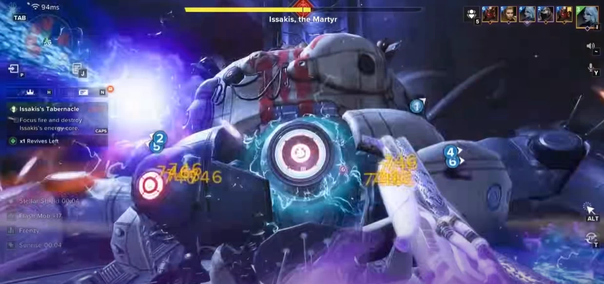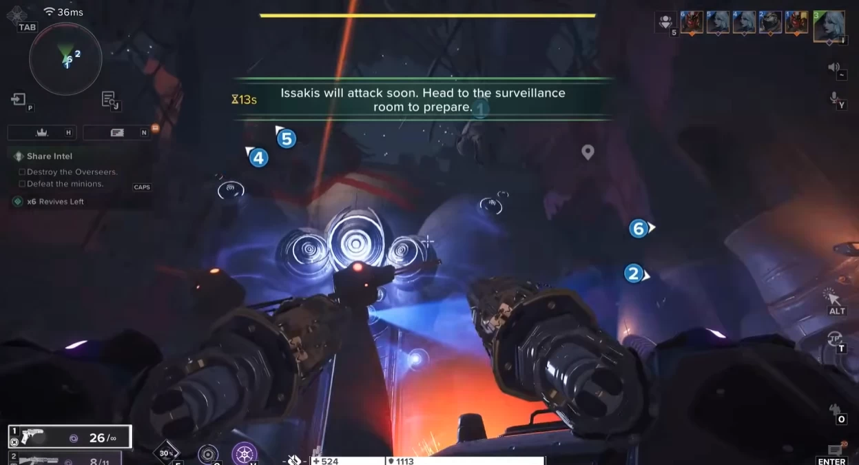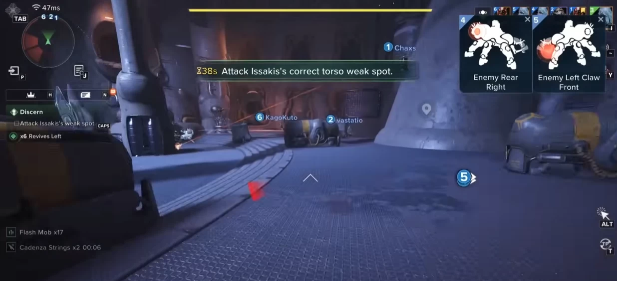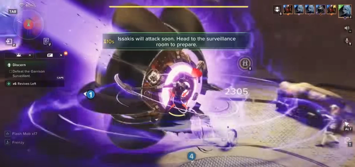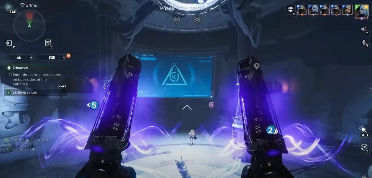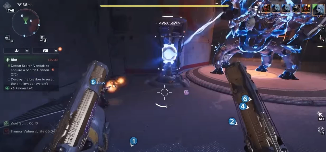 Игрокам, прошедшим через портал, нужно победить больших дронов. Это откроет доступ к монитору, на котором показана часть тела босса, по которой команда должна стрелять. Вы должны сказать своим тиммейтам через голосовой чат, что вы видите на мониторе. Если голосовой чат по какой-то причине использовать нельзя, вы можете указать своим тиммейтам на нужную часть босса через контекстное меню.