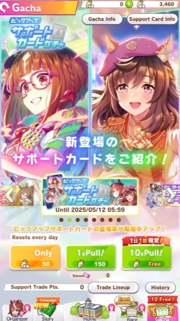 В Umamusume: Pretty Derby есть два типа баннеров — на персонажей и на карточки. Особенность игры в том, что в ней нет такого понятия как «стандартный баннер» — на всех баннерах есть персонажи или карточки с повышенным шансом выпадения. Ещё в игре нет «лимиток». Это значит, что все персонажи и карточки отправляются в общий пул и могут выпасть со всех последующих баннеров.