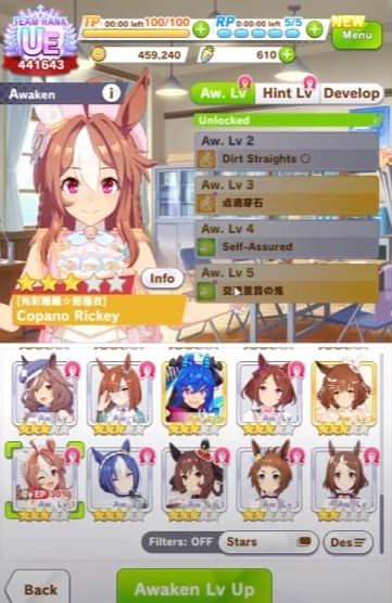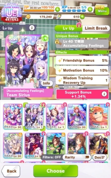 Далее нужно выбрать 6 карточек поддержки. Данные карточки дают нам различные бонусы и ивенты во время тренировок. Исход тренировок в основном зависит именно от них, а не от тренируемой пони. Поэтому, если вы захотите создать серьёзный аккаунт, то вам придётся крутить в основном карточки, а не персонажей.