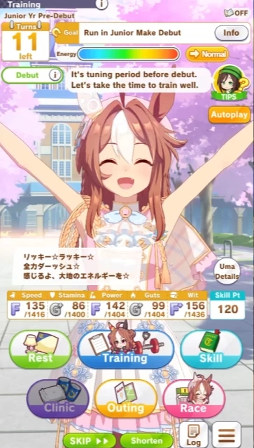 Итак, персонажей и карточки мы подготовили. Наконец-то настало время познакомиться с основной игровой механикой игры. Речь пойдёт о режиме тренировок. Здесь нам предлагается выбрать один из тренировочных сценариев. На японском сервере есть уже 10 различных сценариев, но на релизе глобала нас ждёт только первый из них, сценарий «URA». Вы выбираете персонажей и их «родителей», от которых они будут наследовать различные бонусы. Так как это сложная система, игра может автоматически подобрать родителей вашим персонажам.