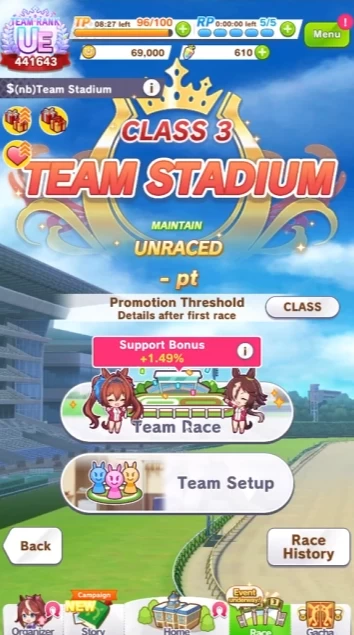 - Race — можно тратить ходы на забеги вместо тренировок. В забегах персонаж обычно получает больше очков навыков. За них также дают различные ресурсы, в том числе могут дать немного самоцветов. Но при этом забеги практически не прокачивают параметры нашей пони. В игре также есть множество ачивок и заданий, связанных с различными забегами.