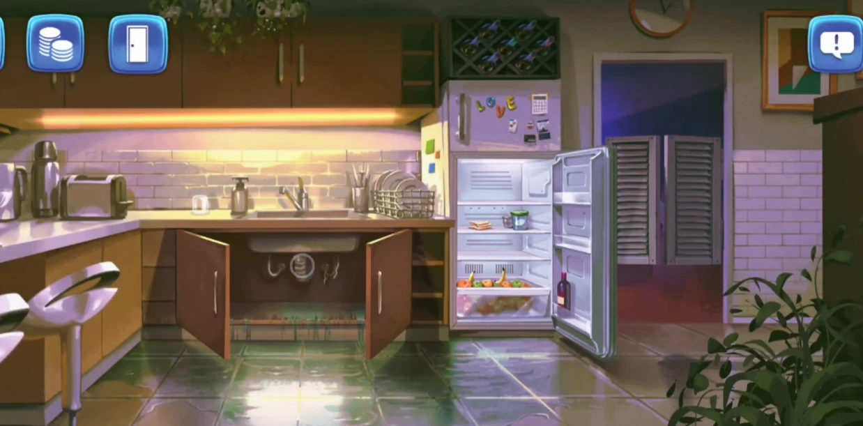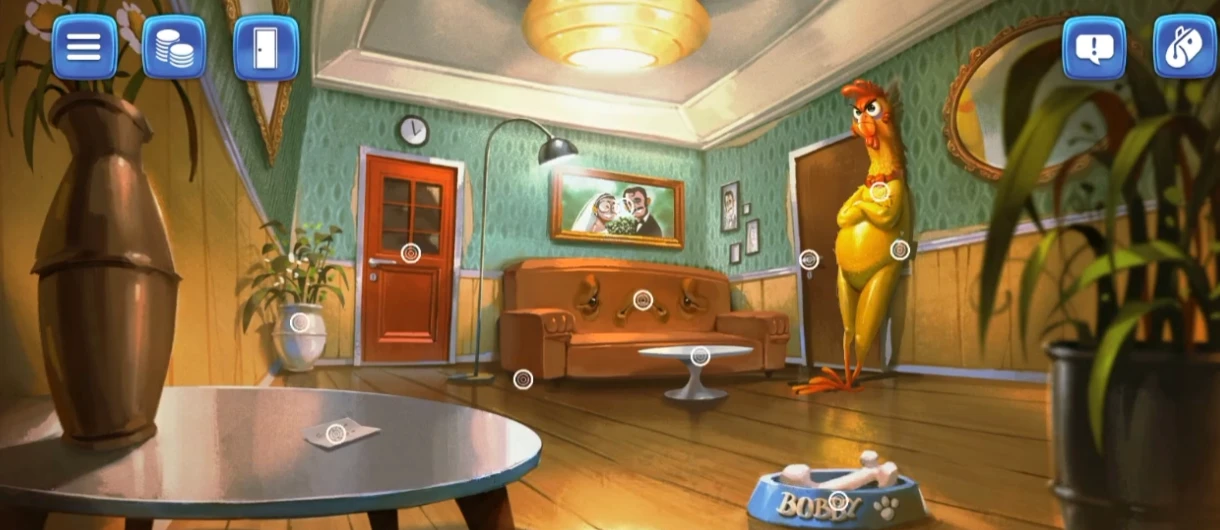 Нажмите на портрет молодожёнов, чтобы снять его и найти за ним колесо с числовыми кодами. Пока что оно нам не нужно, отправляемся на кухню через красную дверь.