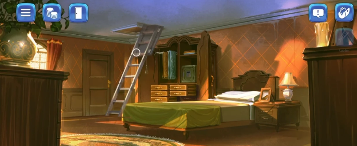 Вернитесь в комнату с сейфом. Объедините вешалку и плоскогубцы, а потом потяните вход на чердак. Заберите лестницу.