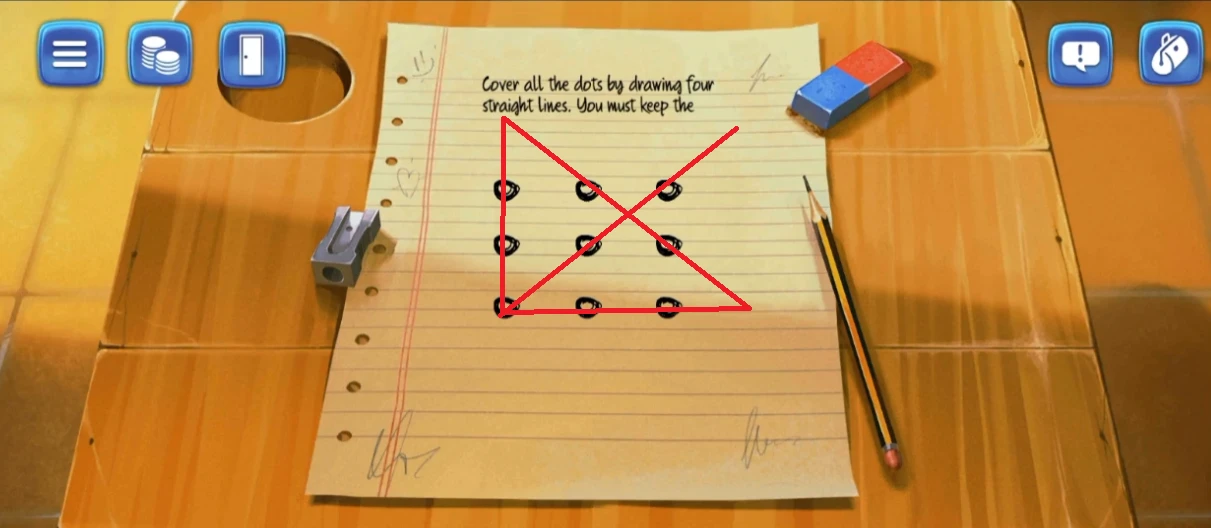 В школе вам нужно решить тест — соединить все круги с помощью четырёх линий. Для этого нужно выйти за рамки этих кругов. Должно получиться так, как на скриншоте ниже.