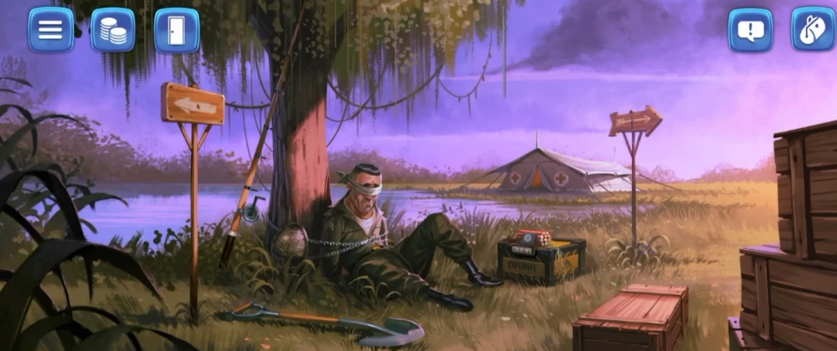 Перейдите на локацию с привязанным к дереву мятежником. Заберите лопату, шлем и удочку.
