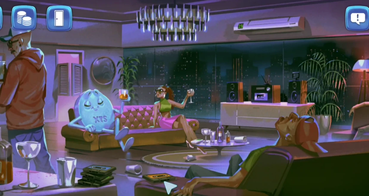 Кладём кукурузу на стол в зале, втыкаем штопор в курицу и вынимаем его. Входим в комнату и застукиваем нашего хозяина с незнакомкой.