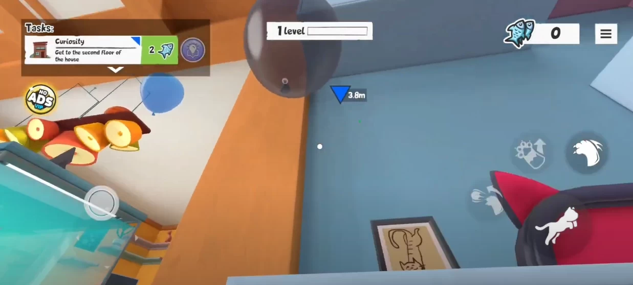 Десятое задание — забросить мяч в баскетбольную корзину. Мячи расположены на втором этаже, а корзина на первом. Возможно, вам понадобится несколько попыток, чтобы «нащупать» местную физику и забить «трёхочковый». Конечно, легче всего — это вскарабкаться с мячом над корзиной и просто выпустить мяч из своих кошачьих лап.