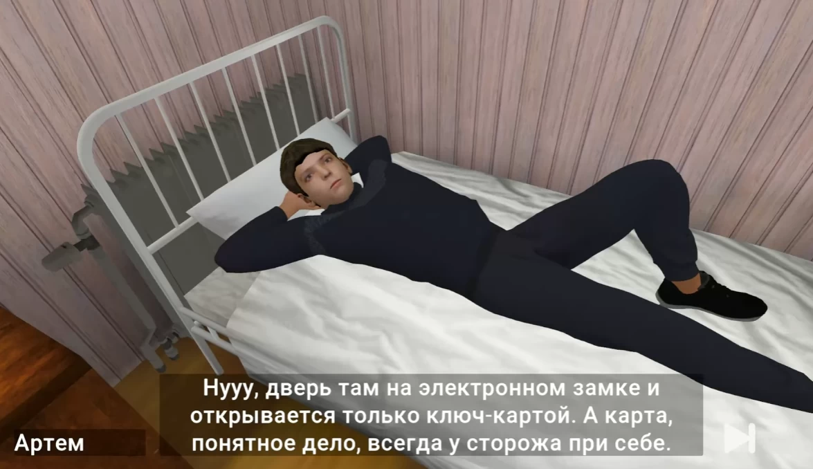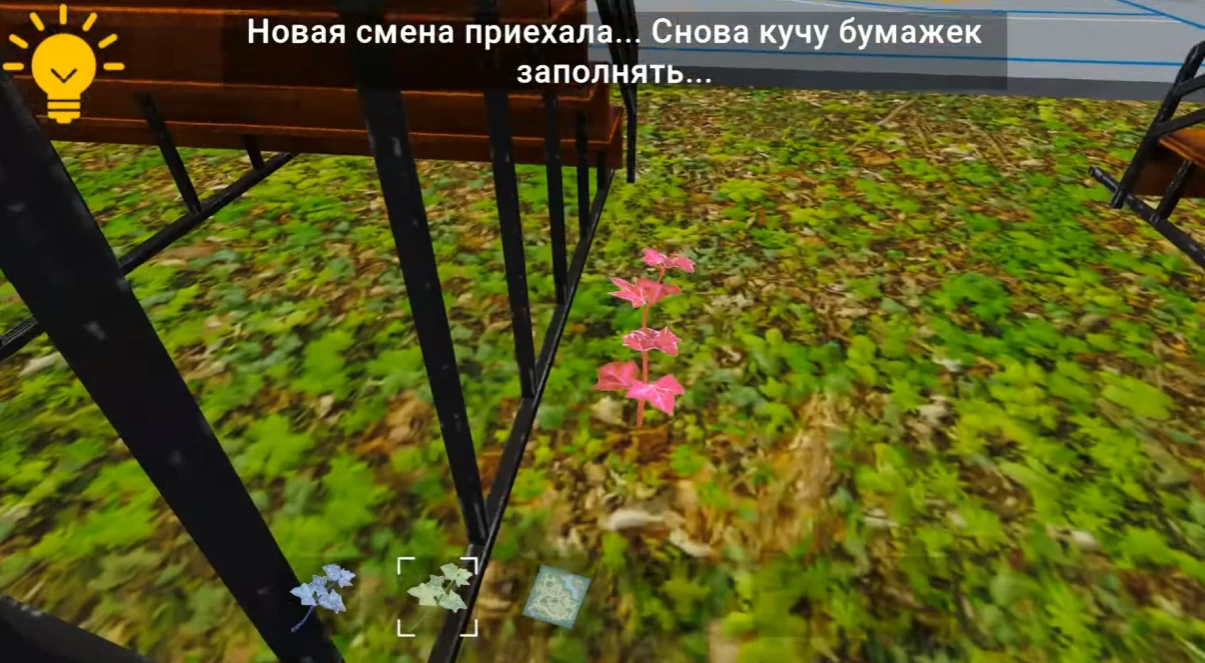 Говорим с Артёмом и узнаём, что у сторожа есть ключ-карта, которая открывает дверь КПП. Проблема в том, что сторож от неё не уходит. Единственный способ его отвлечь — подсыпать слабительное в еду. Нужные колбы находятся в медпункте, но сначала нужно найти 3 растения: красное, зелёное и синее.