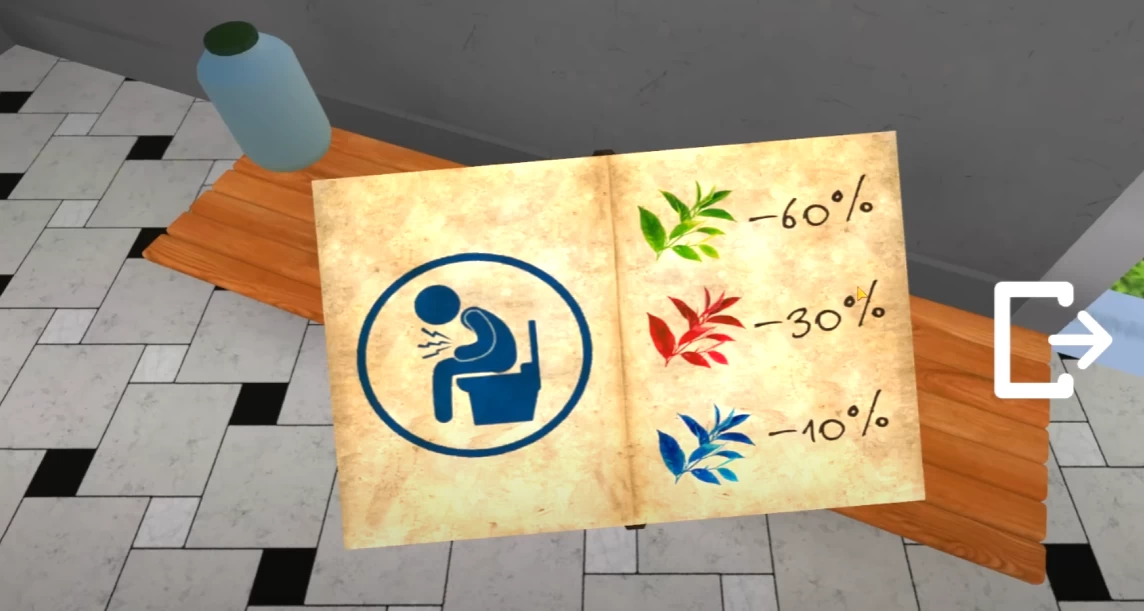 Находим медпункт и читаем инструкцию приготовления слабительного — 60% зелёного, 30% красного и 10% синего. В колбе набираем такую пропорцию и получаем слабительное. Возвращаемся к Артёму и говорим, что у нас всё готово. Он предлагает подлить слабительного в бутерброд в столовой. Плюс нужно взять карту местности.