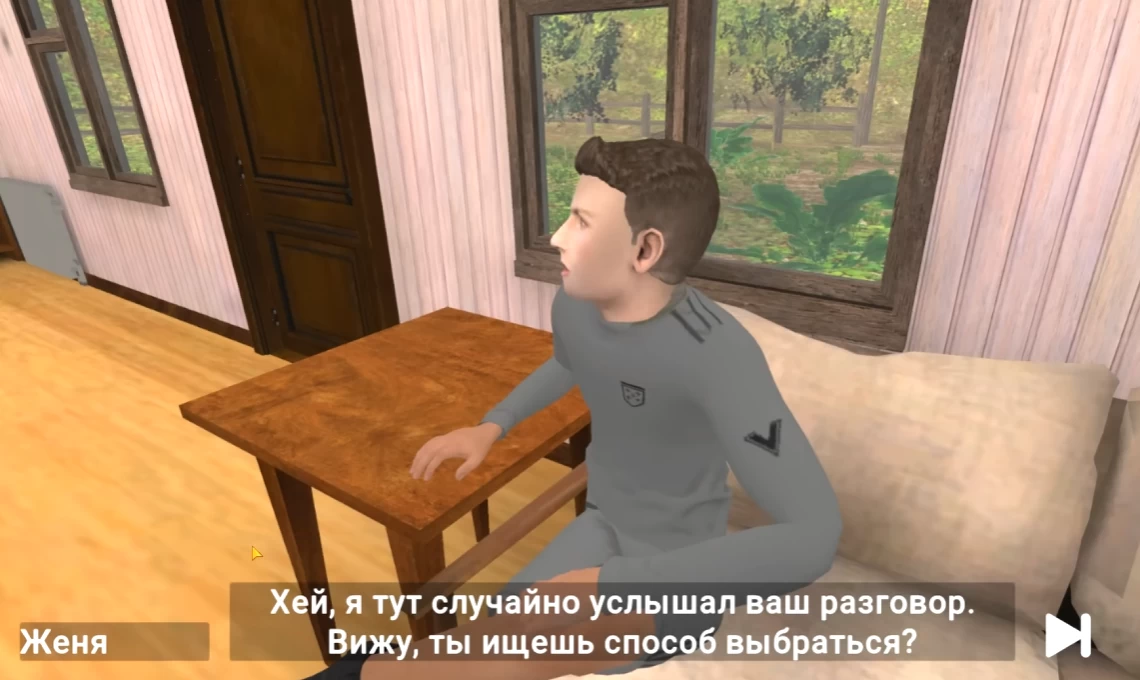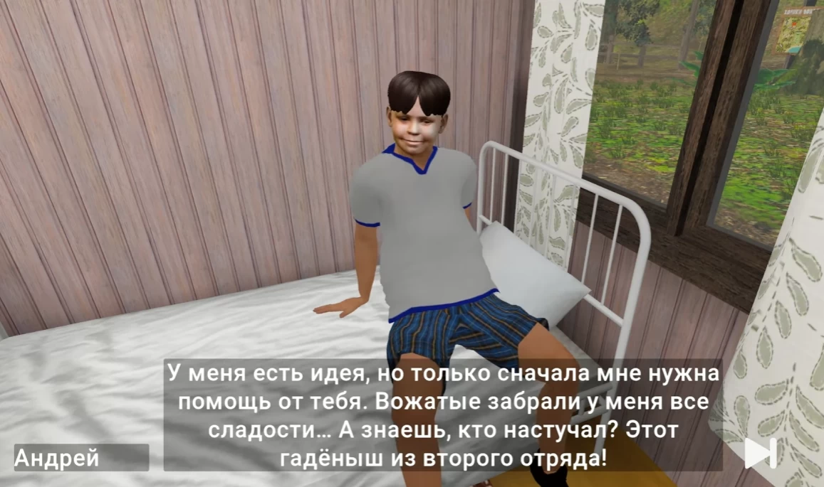 Говорим с Андреем. Он рассказывает, что можно спрятаться в продуктовом грузовике у столовки и уехать на нём из лагеря. Проблема в том, что в столовой постоянно находится повариха. У Андрея есть идея, как с ней справиться, но сначала нужно вернуть ему сладости и проучить стукача.