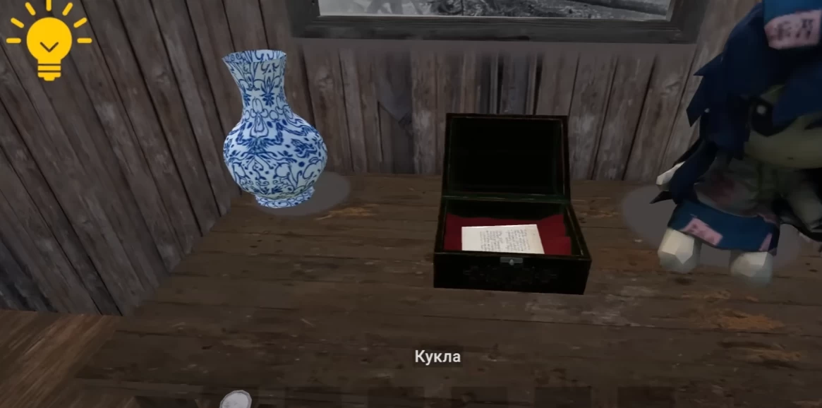 Внутри заброшенного дома возьмите вазу, куклу, гребень и фотографию. Картину повесьте над столом, вазу и куклу поставьте на тарелки. Заберите страницу дневника из шкатулки.