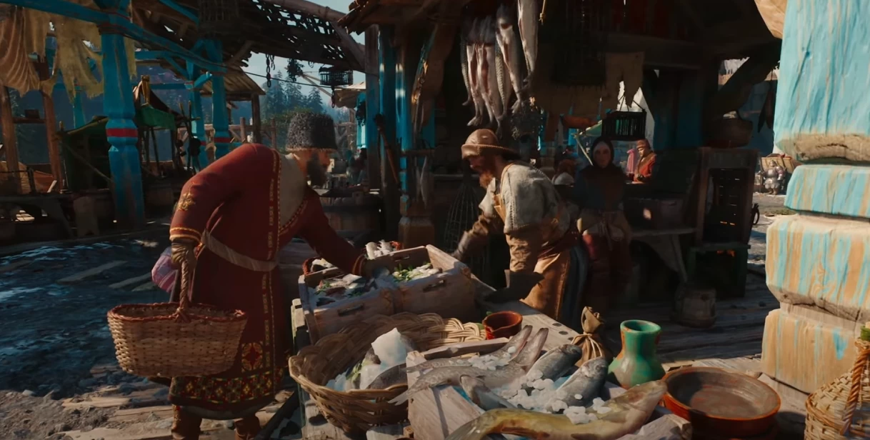 Далее разработчики показали, как NPC взаимодействуют друг с другом. За пример они взяли сцену с торговцем рыбы и покупателем. Когда покупатель просит порезать для него одну из рыбёх, продавец берёт её в руки и отдаёт своей помошнице, которая сразу же приступает к делу, а до этого она отгоняла ворону с прилавка.