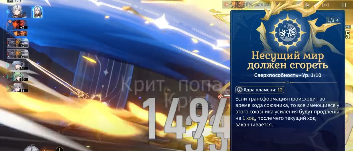 - След «Марш забвения» — +1 ядро в начале боя и +3 ядра после окончания трансформации.