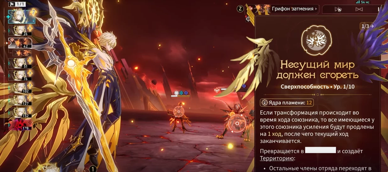 Несущий мир должен сгореть — если трансформация происходит во время хода союзника, то все имеющиеся у этого союзника усиления будут продлены на 1 ход, после чего текущий ход заканчивается. На время действия Территории все враги имеют физическую уязвимость, а союзники убираются с поля боя.