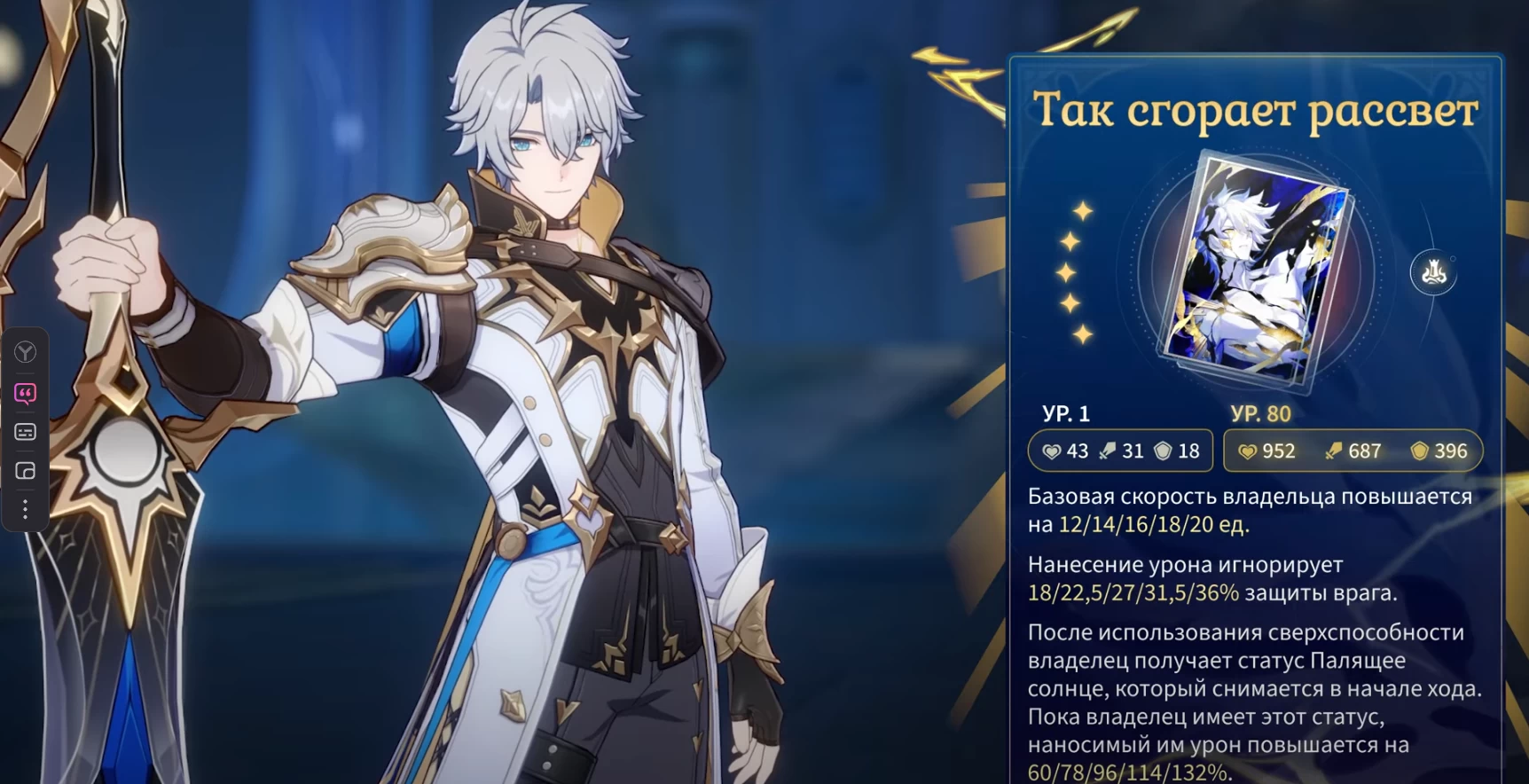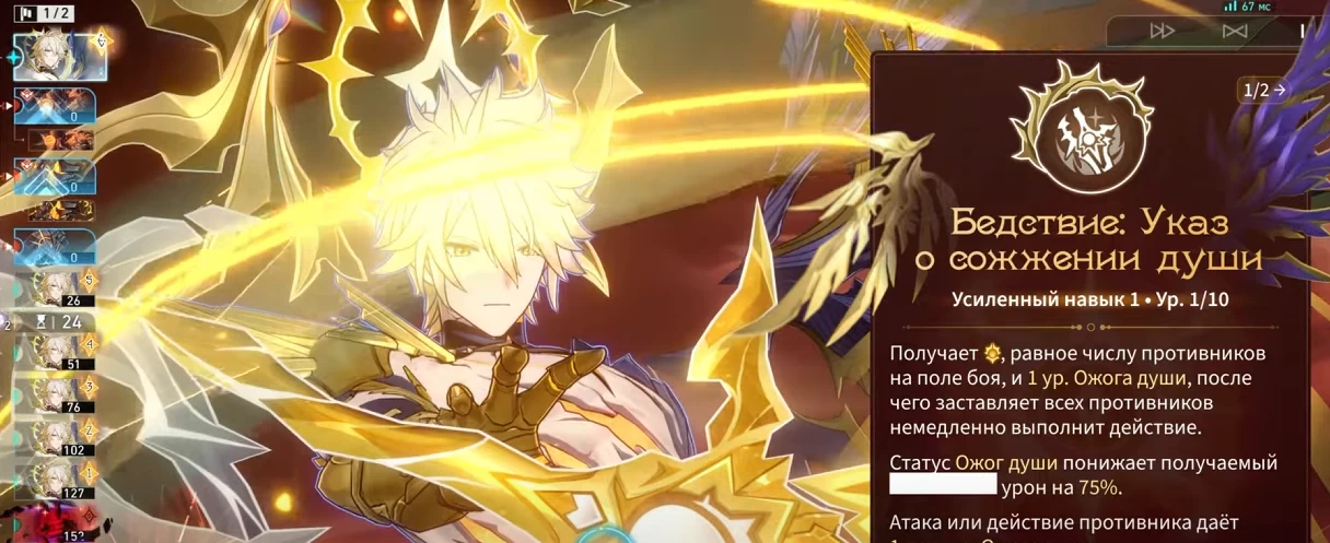- Да будет свет (навык) — получает 2 ядра пламени и наносит выбранному противнику физический урон, равный 150/300% от силы атаки, и физический урон соседним целям, равный 60/120% от силы атаки.